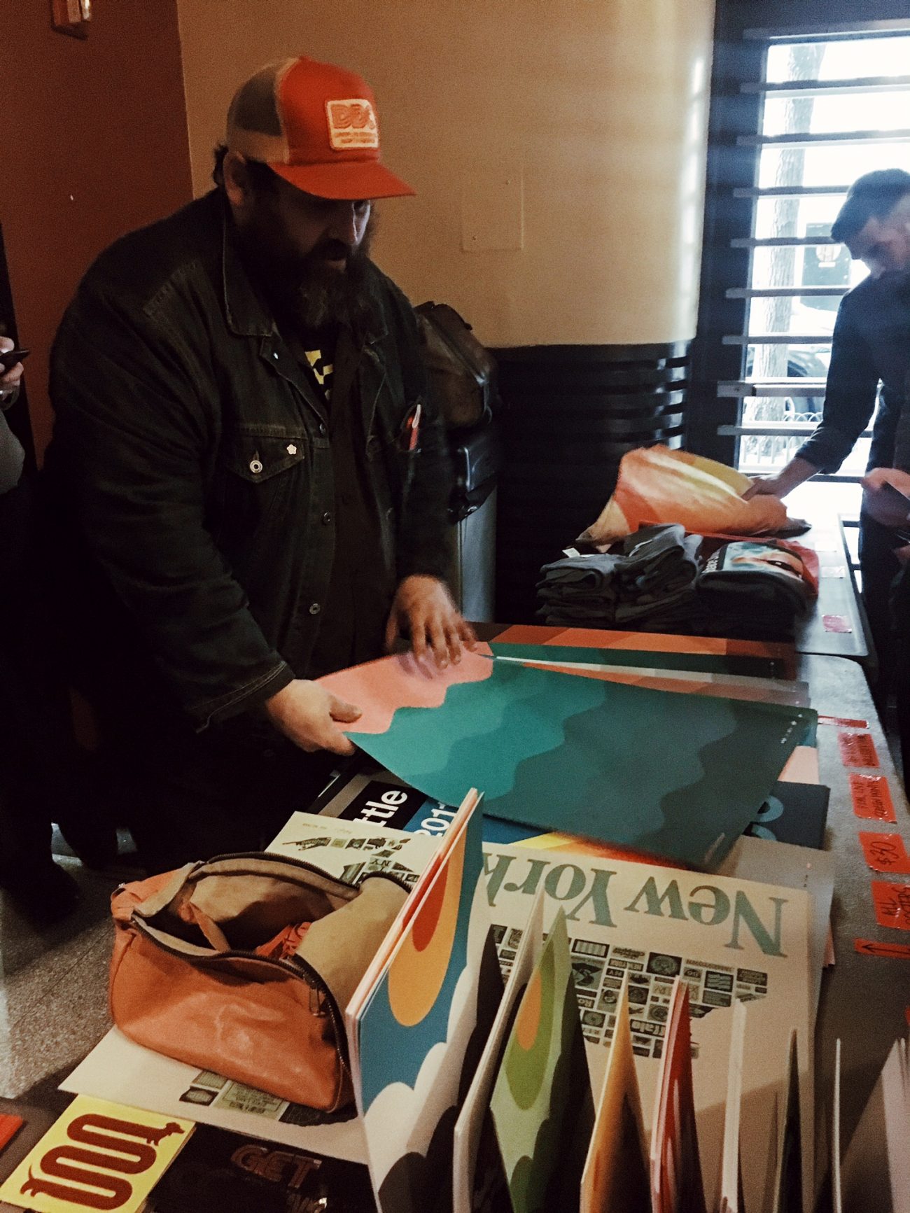 For someone who is always on brand with his design aesthetic, Draplin never goes off brand with his personal aesthetic. Aaron’s strength is his “every-man” appeal and dialect. His approachability and commitment to honesty is something to admire in a world that is driven by image and status. He never dresses up for an event or for other people; rather, he always wears what he is comfortable in and what represents him as a person. Meeting him was not like meeting other famous designers in that he had a very casual conversation with me about the merch he was selling and how “cash is king.” You would never know he was one of the most famous people in the design community due to his humble demeanor.