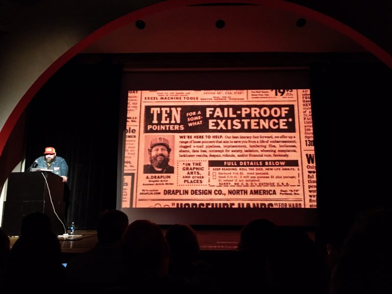 Although the talk was originally supposed to be “Tall Tales From A Large Man,” Draplin decided to change up the content and talk about what it was like creating his new book, “Pretty Much Everything,” which will be released on May 17th.