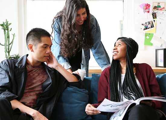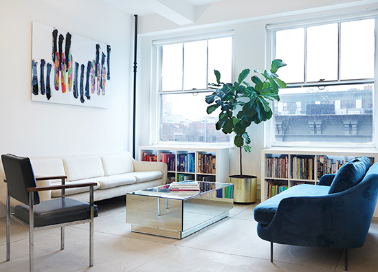 Decorated in simple whites and blacks, the studio shines with morning light. An extensive collection of magazines and reference books ranging from early millennial Vanity Fair to German graphic design handbooks adds a needed color “pop” to the monochromatic story. We also used matte metallics as an accent throughout to add some whimsy to the industrial feel of the space.