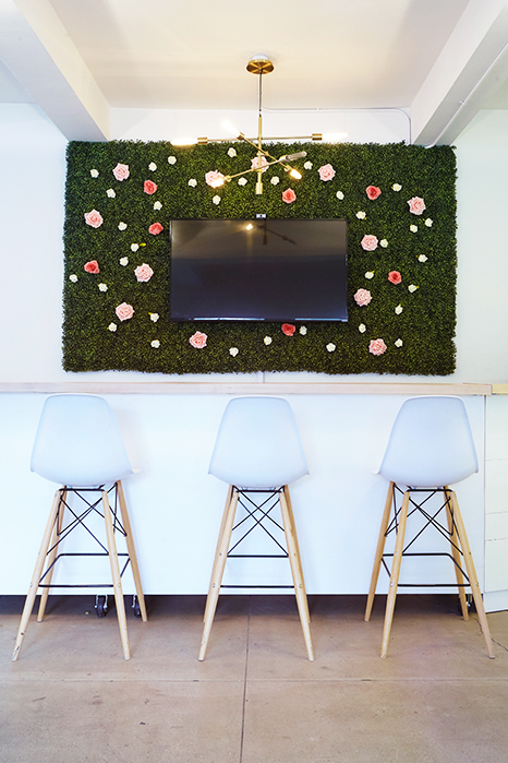 The green wall behind the bar adds a needed freshness to the office. Accompanied by a gorgeous brass chandelier, this area sets a tone for the interior climate felt as soon as you walk through our doors. The design highlights our style and precision to details in everything we do.