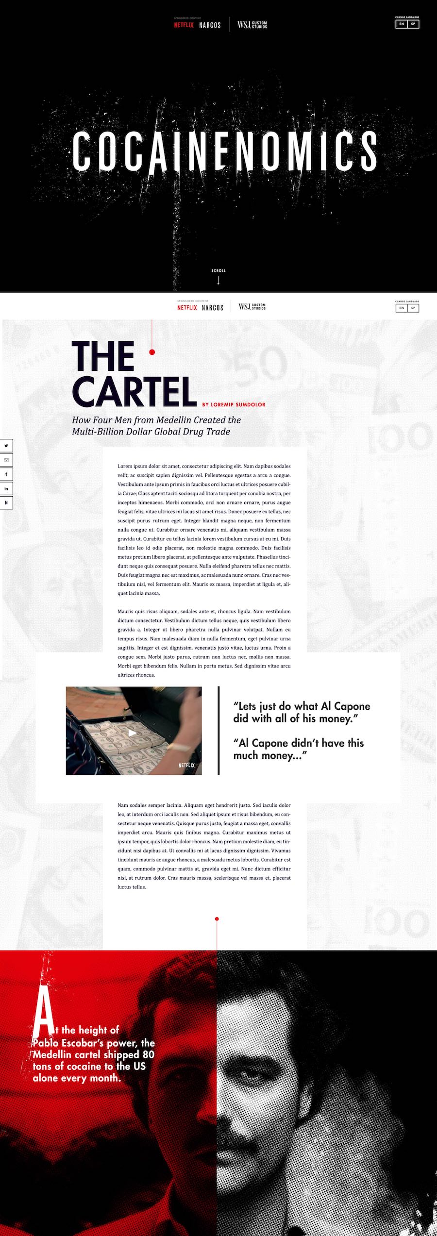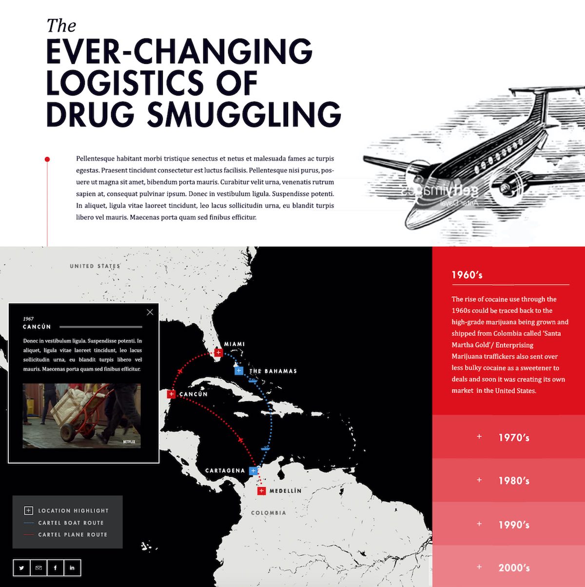 An interactive map and timeline accordion communicated the length of how far the drug trade had spread over continents and decades. In one quick glance, readers were able to visualize the stronghold of the Medellín Cartel.